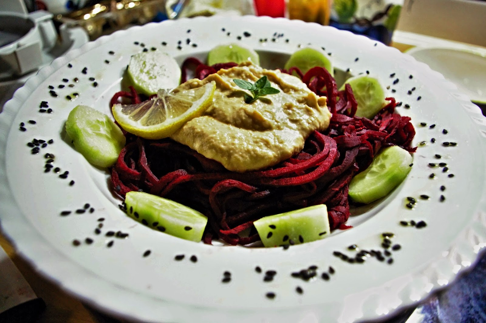 Trochu ve spěchu jsem se dívala kolem sebe. Naproti seděl pár. Podle jejich rozhovoru spolu museli být krátce a hodně zamilovaní, protože ona ho neustále přemlouvala, aby ochutnal. On jí neustále a rádoby klidně připomínal, že jí slíbil, že sem s ní půjde, ale nic si nedá!, načež jí v mobilu začal ukazovat stejky, které by si dal mnohem raději. Vzájemně se tak přetahovali úctyhodně dlouho, on dokonce, s patričně vyděšeným výrazem ve tváři, ochutnal jedno sousto, ale ustáli celou tu scénku dobře. U dalšího stolku seděla dívka s úplně jinou dynamikou. Takhle určitě vypadají ti raw strávníci, napadlo mě. Lněné šaty, zpomalené pohyby, pomalé žvýkání … tak pomalé až jsem měla chvílemi pocit, že místo jedení přejde na fotosyntézu.