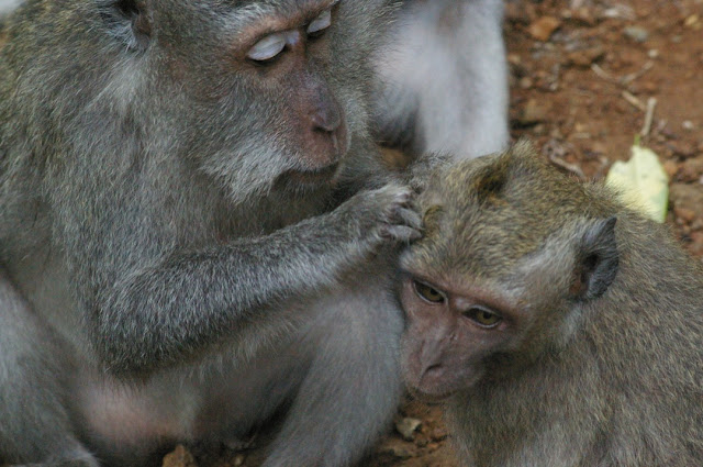 Vždycky nás přišel uvítat některý ze samců a snažil se, aby k nám a dobrůtkám, které jsme přinesli, nepronikl už moc nikdo další. Asi jen dva si přišli pro jídlo z ruky do ruky, ostatním jsme raději jen hodili. Jeden na nás začal bez důvodu lehce startovat, ale nic si nedovolil. Maminky byly úplně kouzelné, hlídaly si svoje malé poklady a i před foťákem je celkem schovávaly. S vybíráním vší si hlavu vůbec nelámaly jako my, matky dětí školou povinných. Prostě hledaly, když našly, strčily si dobrůtku do pusy a jelo se dál.