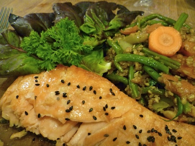 Rýže, směs asijských mladých listů, fazolky. Tentokrát podle nového receptu, který určitě stojí za vyzkoušení: Fazolky bez šťopek povaříme asi 10min.a prudce ochladíme. Na pánvi s olejem velmi krátce orestujeme česnek, přidáme fazolky. Chvíli restujeme, přidáme malou lžičku medu, tymián a na závěr trochu sojové omáčky.