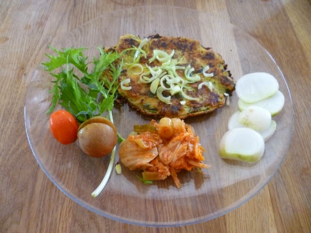 Z natě celeru, brambor, cukety a všeho co dům a bedýnka dá můžeme udělat „bramboráčky“. Výborné s kysaným zelím, pickles nebo kimči (na fotce). Ředkev, rajčátka a rukola opět z bedýnky.